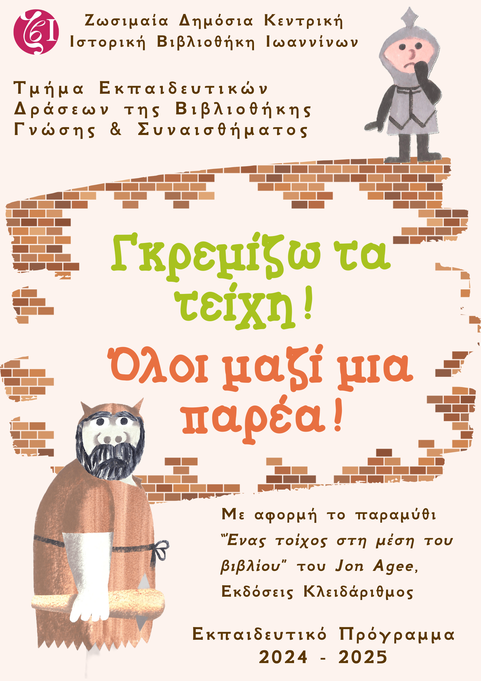 Με αφορμή το βιβλίο «Ένας τοίχος στη μέση του βιβλίου» του Jon Agee, εκδόσεις Κλειδάριθμος, οι μαθητές/τριες θα μπουν στα παπούτσια του μικρού ιππότη της ιστορίας και θα προβληματιστούν σε σχέση με τα στερεότυπα και τους παραδοσιακούς συμβολισμούς (καλός-κακός, φίλος-εχθρός) συνειδητοποιώντας πως ότι φαίνεται ως αληθινό μπορεί και να μην είναι και πως η χαρά βρίσκεται στην ενότητα, τη συμπερίληψη και τη συντροφικότητα. (περιλαμβάνονται: ενημερωτική παρουσίαση για τη Ζωσιμαία Βιβλιοθήκη, αφήγηση, συζήτηση, κινητικό παιχνίδι, διαδικτυακά παιχνίδια)